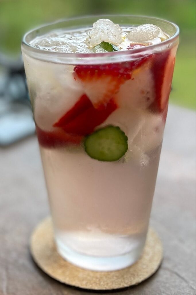In a pitcher or large bowl, gently muddle the strawberries and cucumbers with a spoon or muddler to release their juices.